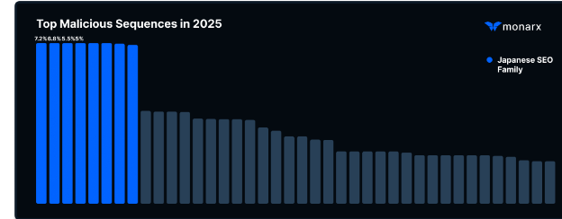 Monarx uses a proprietary approach to categorizing malware based on its behavior. We call these sequences. The tops sequences found in 2025 are displayed below. Notably, the top 8 (colored in blue) sequences all belong to Japanese SEO family.