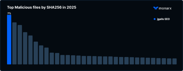Monarx also categorizes malware files by their SHA256 hash. The top SHA256 hashes of malicious files are below. The highest in 2025 was the jgalls SEO malware campaign.